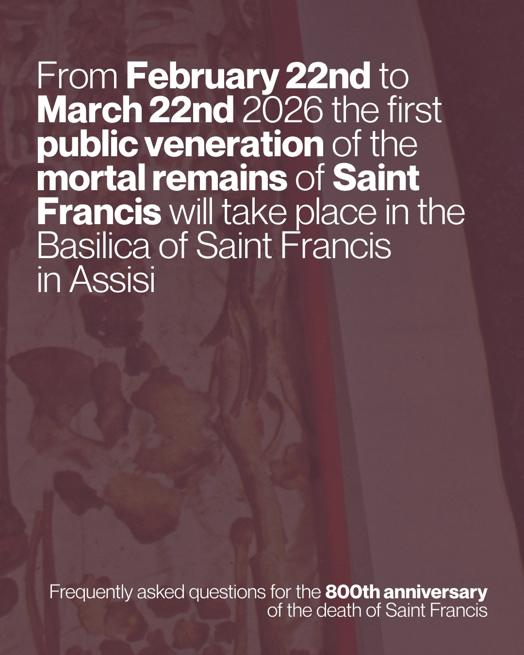 The relics of the Saint will be displayed in Assisi, in the Lower Church of the Basilica of Saint Francis, from February 22 to March 22, 2026.