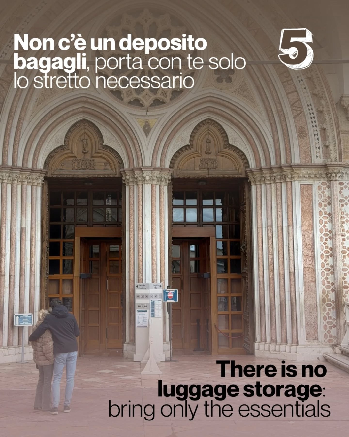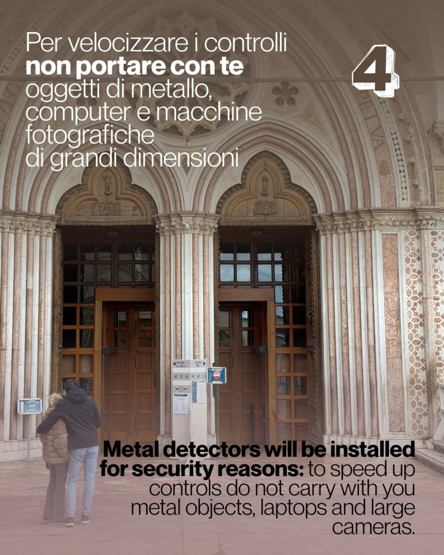 - Arrivare con anticipo: Presentatevi in Piazza Inferiore circa 40-45 minuti prima dell'orario indicato sulla vostra prenotazione per avere il tempo di prepararvi con calma.